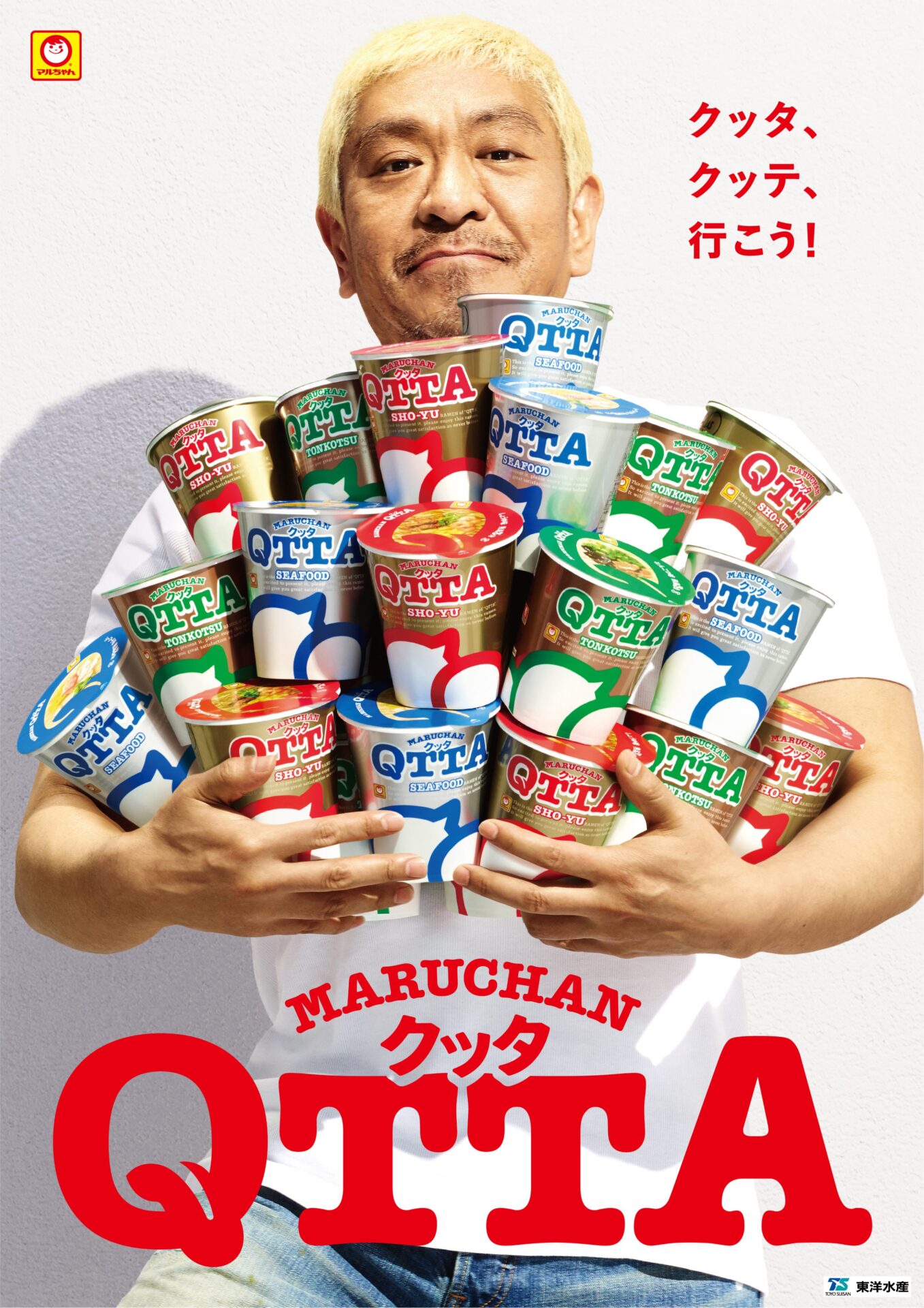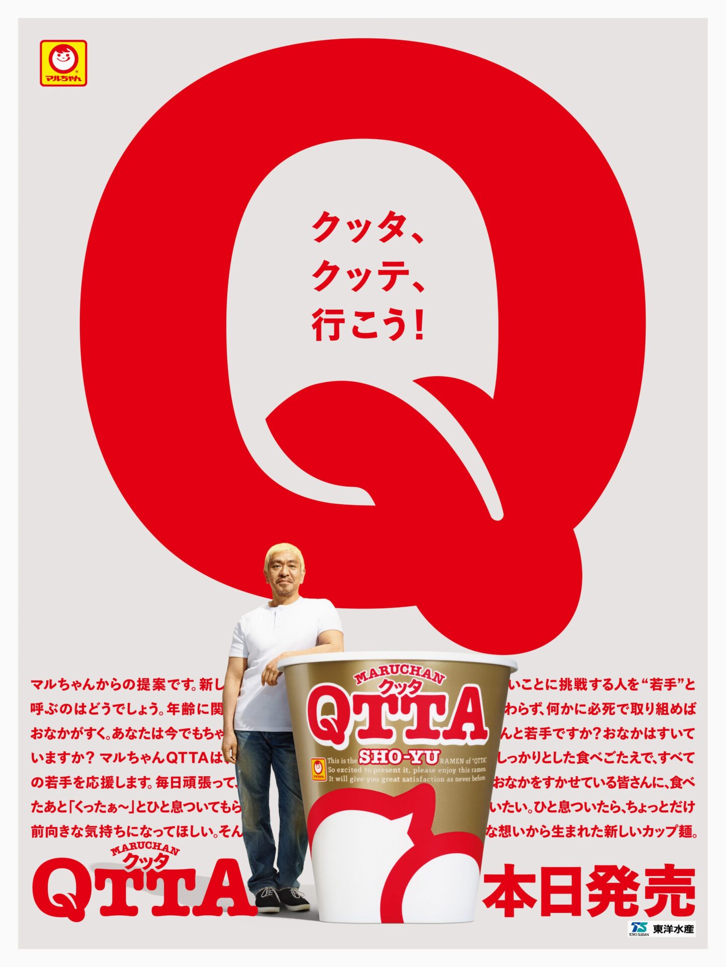 東洋水産の新しいカップ麺「QTTA」のローンチ時のコミュニケーションに取り組みました。食べたあとに思わず「くったぁ〜」とこぼしてしまう。そのしっかりとした食べごたえで、おなかを空かせた若手(=新しいことに挑戦する人)を応援するメッセージを新聞広告に掲出しました。